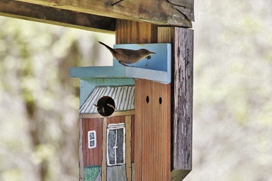 A twig is sticking out the hole and he's perched on it as he sings his song.