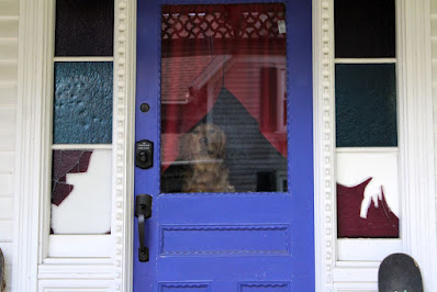 The dog jumped up on the door and barked at me, even though I was a respectful distance away.